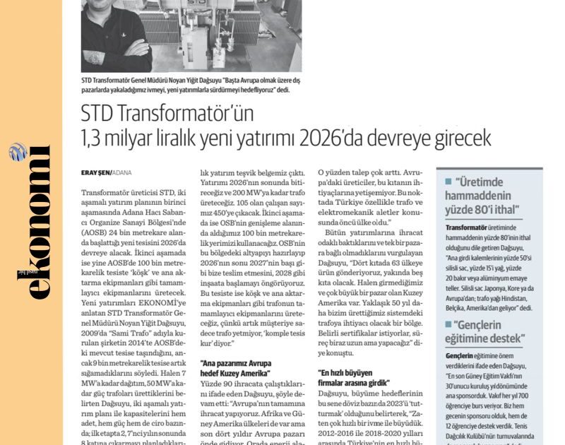 STD Transformatör’ün 1.3 Milyar Liralık Yeni Yatırımı 2026’da Devreye Girecek